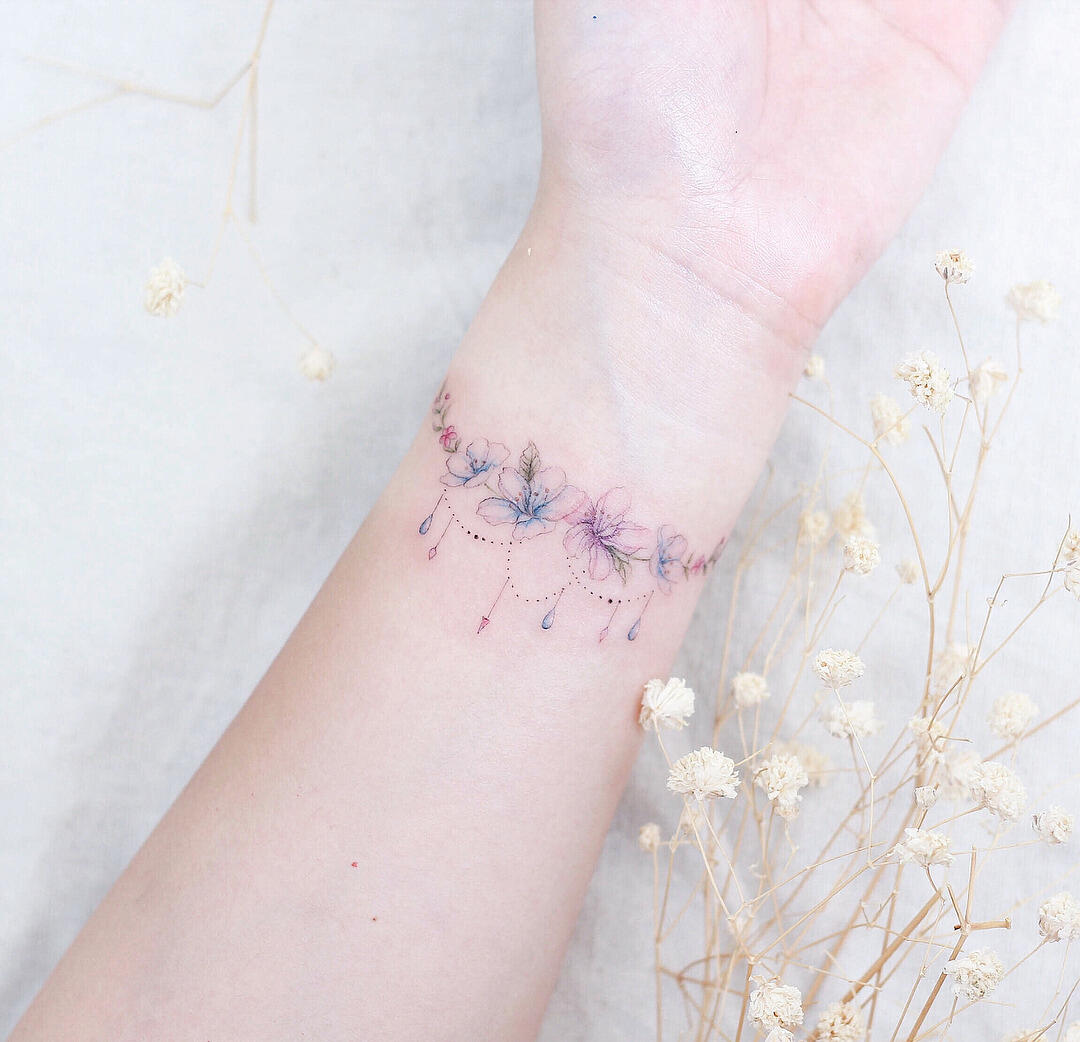Left Wrist: Pastel floral bracelet on the inside of her wrist, wrapping around to her scales